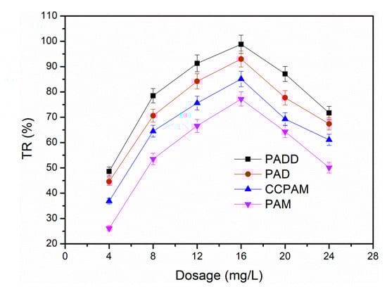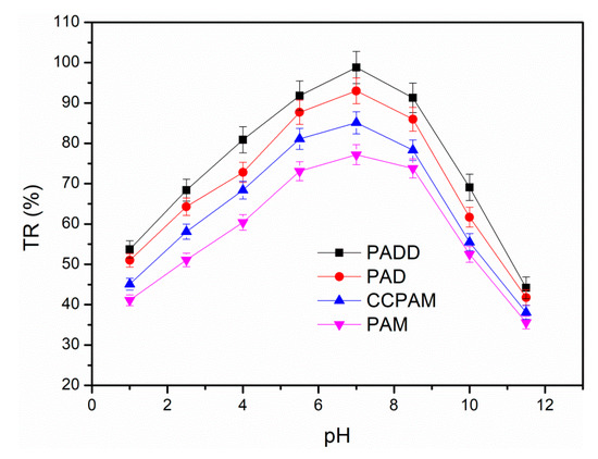 The flocculants displayed individual variation on flocculation performance under different pH values, which proved that pH played an important role for coal mine wastewater treatment. As the pH value gradually increased, the turbidity removal of coal mine wastewater first increased and then decreased. When the pH value was 7.0, the removal rate of the four flocculants reached the maximum value. The neutral condition (pH = 7.0) was more conducive to the removal, while the strong acid and alkali condition was not favorable for the coal mine wastewater flocculation. Excessive H+ ions from a strong acid environment led to strong electrostatic repulsion between coal colloids, which prevented the growth of flocs and reduced the flocculation efficiency [30]. On the contrary, the turbidity removal rate efficiency of the coal mine wastewater was declined under the strong alkalinity condition, and the flocculant performance was also undesirable. On the one hand, the -NH2 group of flocculants tended to hydrolyze under the strong alkalinity condition [4]. On the other hand, the colloid was wrapped by superfluous OH− groups to become negatively charged groups. It will result in an electrostatic repulsion between colloids. Consequently, the charge neutralization ability of flocculant reduced, and the TR of coal mine wastewater decreased. During the whole pH range, PADD displays the most excellent flocculation performance among these flocculants. Moreover, within the pH value range of 4.0–8.0, PADD had good performance on TR, indicating that it possessed more extensive application in the actual treatment process of high-turbidity polluted water.