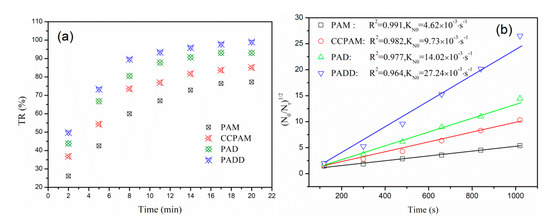 As shown in Figure 8a, turbidity removal of coal mine wastewater with four flocculants increased rapidly at first, then increased slowly until it was stable. Clearly, among all flocculants, the coal mine wastewater turbidity removal rate of PADD increased at the fastest rate for the first 9 min. At the same time, the simulated curve slope (KN0) of the four flocculants was fitted in Figure 8b and the values were arranged in the following order: PADD (KN0 = 27.24 × 10−3·s−1) > PAD (KN0 = 14.02 × 10−3·s−1) > CCPAM (KN0 = 9.73 × 10−3·s−1) > PAM (KN0 = 4.62 × 10−3·s−1). Among them, PADD has the highest slope value, indicating that PADD has the best flocculation effect. PADD has high cationic degree (40%) with strong charge neutralization ability, it can completely attract and neutralize negatively charged coal mine wastewater colloidal particles, resulting in the loss of colloidal stability. On the other hand, PADD has a high molecular weight (4.0 × 106 Da) with strong adsorption bridging effect. The molecular chain of the PADD will effectively intercept and wrap colloids to form a large flocculent structure [31]. In addition, hydrophobic phenyls in PADD polymer chains will lead to good extension of polymer chains, and more active sites of polymer chains are exposed. More effective molecular collision and flocculation occur between PADD polymer chain and colloidal particles of coal mine wastewater, which improves the flocculation effect of polymer.