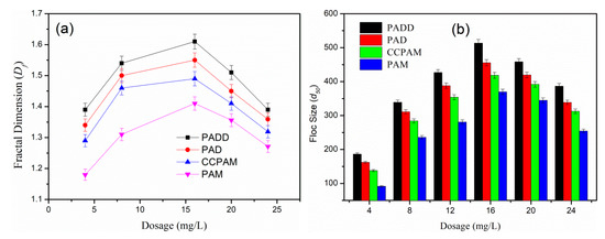 In Figure 9, the floc size d50 and Df of the four coagulants at pH = 7.0 showed a trend of increasing first and then decreasing, and obtaining the maximum value at 16 mg/L. The Df (1.61) and particle size (d50 = 513.467 μm) of PADD reached the maximum on this condition. The dosage can affect the structure characteristics of flocs by affecting the surface properties of colloids in coal mine wastewater. Only under the action of proper amount of flocculant, cationic groups on polymer chains can attract and neutralize negatively charged colloidal particles completely by the action of electrostatic attraction [37]. The polymer molecular segments adsorbed with colloidal particles of coal mine are free to extend into the solution and collide with other colloidal particles under the action of adsorption bridges, and aggregate into flocs with large and dense structures [38]. However, due to the excessive dosage of flocculant, the electrostatic repulsion between colloidal particles in coal mine wastewater increases, making it difficult for colloidal particles to be captured and fixed by polymer molecular chains, and it is difficult to aggregate to form large and dense structures. Compared with the CCPAM and PAM, the particle size d50 and Df of PADD and PAD becomes more larger, which indicates that cationic degree and molecular weight can affect the structure of the flocs. As higher cationic degree and molecular weight can significantly improve the ability of PADD and PAD to neutralize, patch, and adsorb bridges. Once PADD or PAD is added to coal mine wastewater, more negatively charged particles are neutralized and adsorbed on molecular chains, and they are entangled by shear stress caused by water agitation. The encapsulated flocs are continuously squeezed, and the voids in the encapsulated flocs are constantly crowded, and the structure becomes more and more compact, resulting in a larger and more compact floc structure [39,40,41]. Therefore, the particle size and Df of the flocs subjected to PADD or PAD increased. The PADD and PAD have the same cationic degree and molecular weight, and therefore it is speculated that the difference of particle size d50 and Df is derived from the hydrophobic phenyl group. It is indicated that the introduction of DABC in the flocculant is more useful to enhance its flocculation efficiency. A relatively low floc size and Df is produced. For PAM, the flocculation performance just relies on the effect of bridging and adsorption rather than charge neutralization and electrical patching, and thereby the flocculation efficiency is discounted, and the lowest floc size and Df are obtained [42].