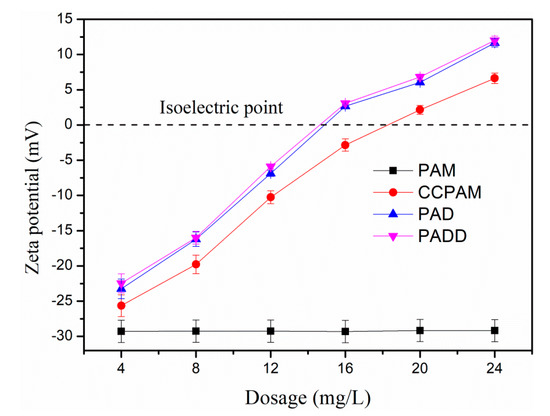 Zeta potential plays an important role in understanding the charge characteristics of colloids in coal mine wastewater. In order to understand the mechanism involved in flocculation process, zeta potential of supernatant after flocculation is analyzed at pH = 7.0. The results were shown In Figure 10. The initial zeta potential of wastewater is negative (−29.30 mV) before adding flocculant. Under these conditions, colloids in coal mine wastewater are very stable and difficult to remove under natural sedimentation. However, with the increase of flocculant dosage, zeta potential of coal mine wastewater changed to positive value. This phenomenon shows that cationic flocculants can greatly change the charge characteristics of colloids in coal mine wastewater, and then affect the flocculation performance. Compared with CCPAM, the relatively high cationic degree of PAD and PADD plays an important role in flocculation through charge neutralization and electric patching, and can neutralize negatively charged colloid of coal mine wastewater more effectively to improve the flocculation performance [30]. In addition to charge neutralization and electric patching, other flocculation mechanisms also play a role in the flocculation process, which can be reflected by the following phenomenon. The PAM with a low molecular weight still shows a relatively unfavorable coal mine wastewater flocculation performance in Figure 6 and Figure 7. It is proved that bridging and adsorption also play an important role in the flocculation process. Compared with PAM, CCPAM with a cationic degree of 20% and a higher molecular weight has a large floc size, Df and large KN0. It is manifested that the charge neutralization, electric patching, bridging and adsorption in CCPAM greatly improves the coal mine wastewater flocculation effect. PADD has a longer polymer chain and high cationic degree to neutralize, capture and adsorb colloids of coal mine wastewater through charge neutralization, bridging, and adsorption, which can form large and dense flocs with large floc size [43,44]. In this condition, flocs can be easily separated from the solution, and reduce the turbidity of coal mine wastewater [45]. The flocculation effect of PADD is better than that of PAD. The main reason is that the grafting of hydrophobic phenyl on PADD promotes the bridging enhancement, so PADD has larger floc size and Df than PAD. As a result, the flocculation performance is better than PAD. In a word, the flocculation process has the function of charge neutralization, electric patching, the positive effect of hydrophobic phenyl group, adsorption bridging during the coal mine wastewater flocculation.