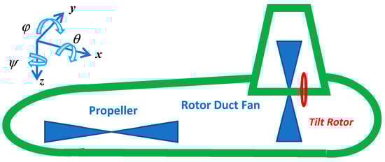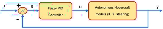 A hovercraft, which is known as an underactuated system and named an air cushion vehicle (ACV), has rotors and a cushion, where inside air pressure enables floating and smooth movement on any surface [,,,,,], such as land, mud, water, sand, and even on ice. The hovercraft is very active and agile; hence, it is applied widely in the coastguard, army, rescue operations, civil engineering, etc. The hovercraft is mounted with a single tilt servomotor on the fin tail. As shown in Figure 1, the rotor duct fan of the hovercraft is settled along the y-axis, while the propeller is attached along the z-axis. Firstly, the lift propeller provides the internal cushion pressure to lift up in a long operation period. Next, the forward moving is created by the rear rotor duct-fan. Finally, the turning typically is operated by directing the thrust airflow through rotor duct fan, which is steered by a tilt servomotor placed at the rear. The subsequently generated momentum is used to maneuver the craft. Although many modern technologies are utilized, the hovercraft still requires an advanced maneuvering system to achieve optimized performance.
