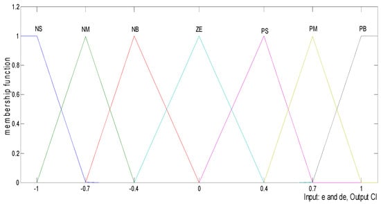 Fuzzy logic concepts are extremely modest but powerful and effective for applications in the control of various machines. The fuzzy control takes advantages in stability and robustness since its aptitude is deal with the nonlinear and uncertain systems. Fuzzy control rules are designed based on the center of area method (COA) for defuzzification and Mandani’s MIN–MAX inference engine type. It includes the tracking error e(t) and the differential tracking error de(t) as the inputs. The fuzzy control output to PID control is defined as eFuzzy(t). Seven partitions of the fuzzy rule-table control, which exploit the triangular membership functions (as shown in Figure 2), are noted in Table 1, which include negative small (NS), negative medium (NM), negative big (NB), positive big (PB), positive medium (PM), positive small (PS), and zero (Z).
