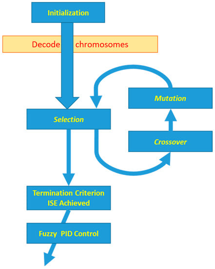 Nevertheless, the standard GA (denoted shortly as sGA) still has some drawbacks; for example, low convergence speed and premature convergence because of requiring hundreds of updated generations. Hence, we proposed a modified genetic algorithm (denoted shortly as mGA) to improve the optimal process. This modified algorithm, just in short operating generations [,,], can improve the global search efficiency and increase the convergence speed of the optimal control design. Next, the proposed control design was a fuzzy-proportional-integral-derivative (F-PID) control [,,,,,,,,,,] that comprises the fuzzy logic control (FLC) and the common PID controller. The first, fuzzy term is employed to increase the stability and the robustness of the controller design by tuning the membership functions and by selecting suitable methods of fuzzification and defuzzification [,,,,,,]. The second, PID control term is separated in two small sub-terms: the PD is employed to maintain the system stability while the term I is utilized to eliminating the steady-state error of the controlled system response [,,,]. Based on the calculation of criterion error of the control system, the “integral of square error” (ISE) [,,] was chosen as a fitness function to show the controller performance index.