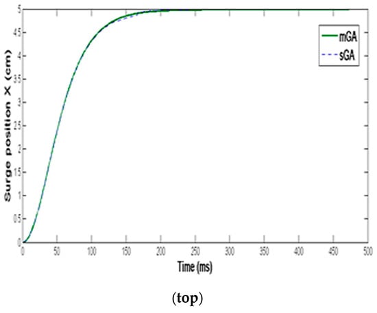 (Top) Surge—position control; (bottom) improved GA (mGA) versus standard GA (sGA) fitness functions.