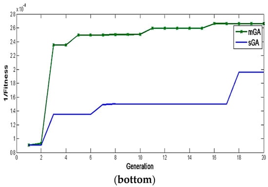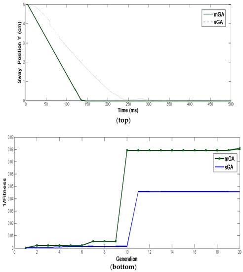(Top) Sway—position control; (bottom) improved GA (mGA) versus standard GA (sGA) fitness functions.