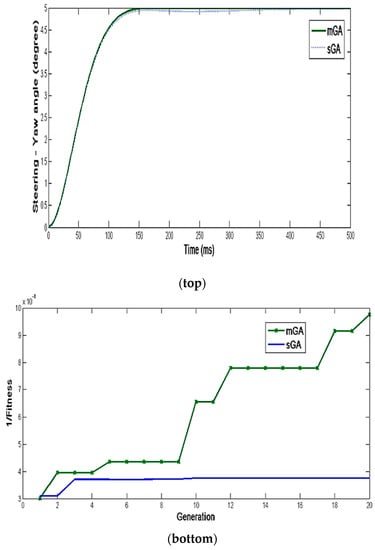 (Top) Steering—Yaw control; (bottom) improved GA (mGA) versus standard GA (sGA) fitness functions.