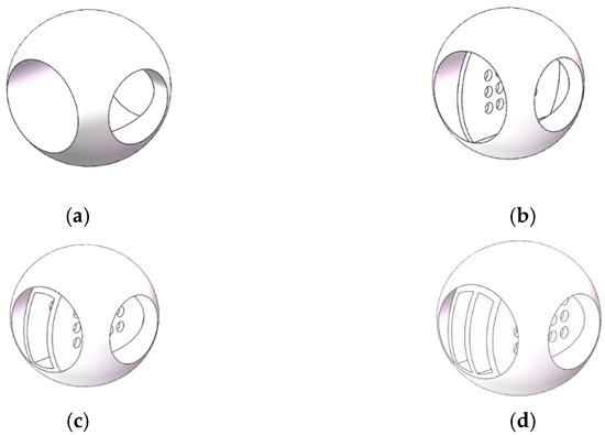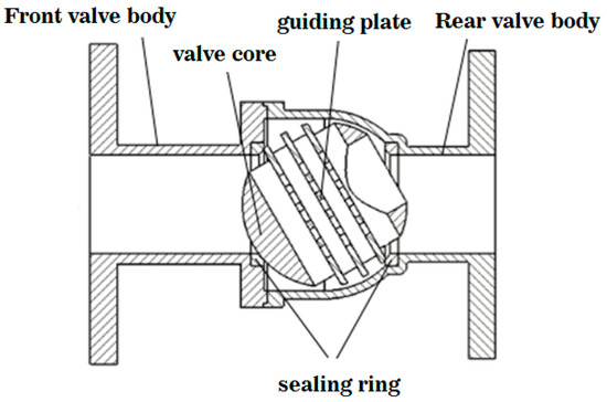 A ball valve (DN50) with good sealing performance and simple structure, which can be closed and opened with a small force, was chosen as the sample valve. The diameter of the valve core was 80 mm and the diameter of the flow channel was 50 mm. In addition, the hole with the diameter of 40 mm was designed in the left side to reduce effects of the high-speed jet flows at small valve opening degrees. The structure of the ball valve with guiding plate (the number of guiding plate is three) is shown in Figure 1.