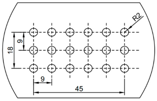 The guiding plate was designed as a rectangle with rounded corners, as shown in Figure 2. Fifteen holes are evenly distributed in the center of the plate, the diameter of the holes is 4 mm, the center distance between two holes is 9 mm, and the thickness of the plate is 3 mm.