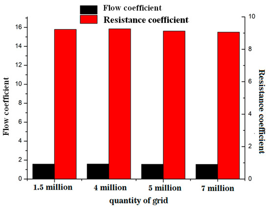 The model valve with 2 guiding plates under 50% opening degree was selected to verify the mesh independence. The total quantity of grids is about 1.5 million, 4 million, 5 million and 7 million, respectively. The histogram of flow coefficient and resistance coefficient calculated by simulation is shown in Figure 5, which displays that the flow coefficient and resistance coefficient calculated under different number of grids are almost same. To ensure the clarity of fluid flow in and downstream of the valve, 3.5 million grids were chosen.