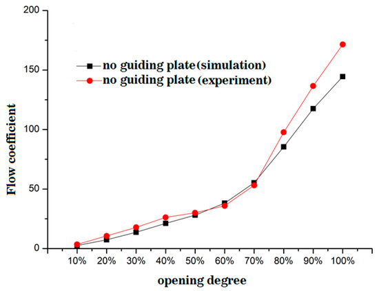 Overall, although there may be some errors between the simulation and the experimental values, most of the data are consistent, particularly when the opening degree is less than 70%, which shows that the numerical method is reasonable. Therefore, the following studies about the effect of guiding plates and valve opening degree on flow characteristic of flows in valve are able to be investigated by the numerical method.