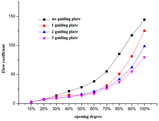 The flow coefficients are plotted at different valve opening degrees and numbers of guiding plates in Figure 8. No matter whether the valve is with guiding plate or not, the flow coefficient increases with increasing valve opening degree. When the opening degree is at 10%–20%, the guiding plate has no effect on flow coefficients, flow coefficients of the valve with or without guiding plate are exactly the same. In addition, with the increase of opening degree (>20%), the flow coefficient of valve without guiding plate is higher than that with guiding plate. This is due to the fact that the flow area is decreased compared to that in the valve core without the plate. When more plates are added, the ability of flows to go through the valve core is further decreased. Similarly, the number of guiding plates has little effect on flow coefficient at 10%–70% opening degree, and until the opening degree is larger than 70%, the flow coefficient decreases apparently when the number of guiding plates increases.