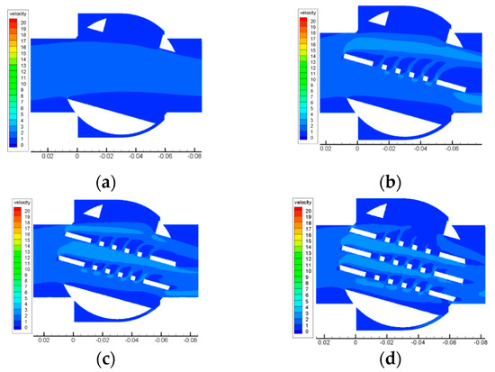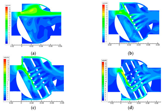 Velocity contours at the valve opening degree of 50%. (a) No guiding plate, (b) 1 guiding plate, (c) 2 guiding plates, (d) 3 guiding plates.