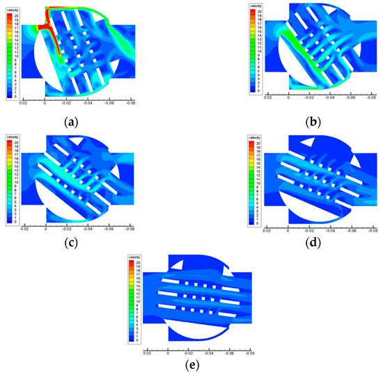 Velocity contours at different valve opening degrees. (a) 10%, (b) 30%, (c) 50%, (d) 70%, (e) 90%.