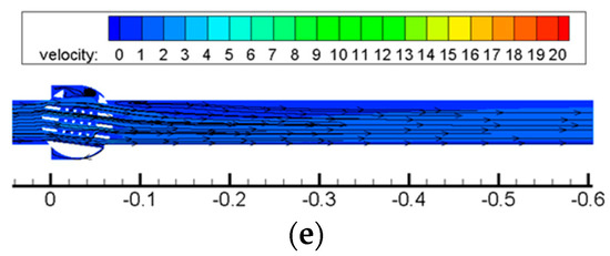 Velocity contours and streamlines of flows downstream of the ball valve with three guiding plates are obtained at different valve opening degrees, and are demonstrated in Figure 15.