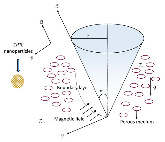 In several real-life situations, fluid flow over a cone is in high demand, for example in healthcare systems, aeronautical engineering, energy storage, astrophysics, space technology, and so forth. Also, in chemical industry, canonical surfaces have been used in filtering, pumping, drilling and degassing machines, and so forth. It is therefore important not only to research these parameters, but also to have an idea of the behavior of liquid fluid flow when it flows along this shape in particular. It is also important to understand and forecast the flow nature and the involvement of nanoparticles in applications for heat transfer to be used in industrial chemical processes.