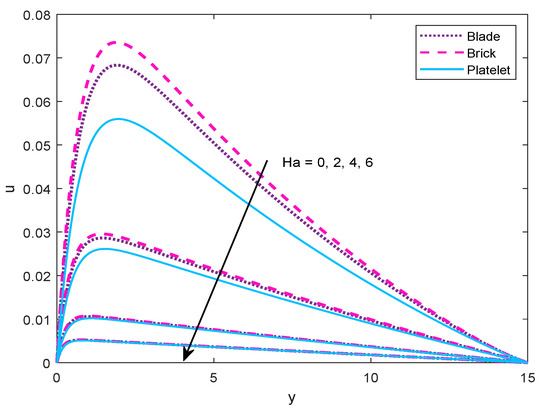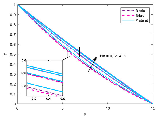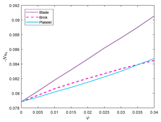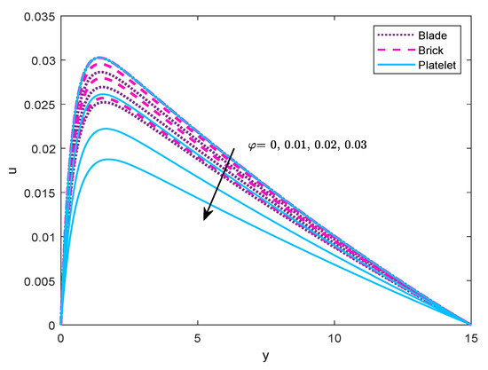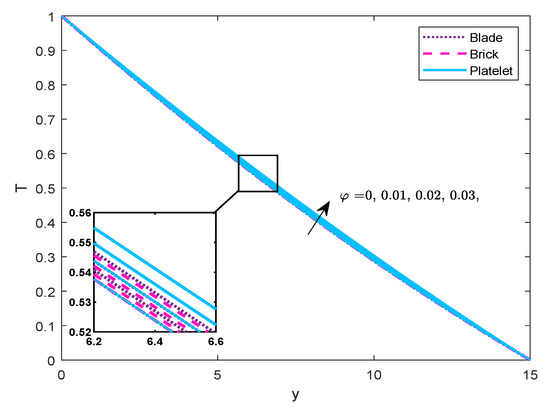 nanoparticles followed by platelet and brick type particles. Whereas the blade-shaped and platelet-shaped particles change the sequence in the temperature profile. It is worth mentioning that the behavior of temperature and velocity are not only affected by thermal conductivity and viscosity, but also by other thermo-physical properties. However, temperature distribution increases with respect to the volume fraction of all active-shapes of