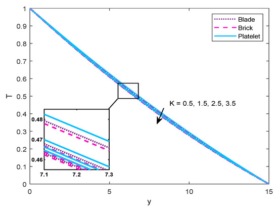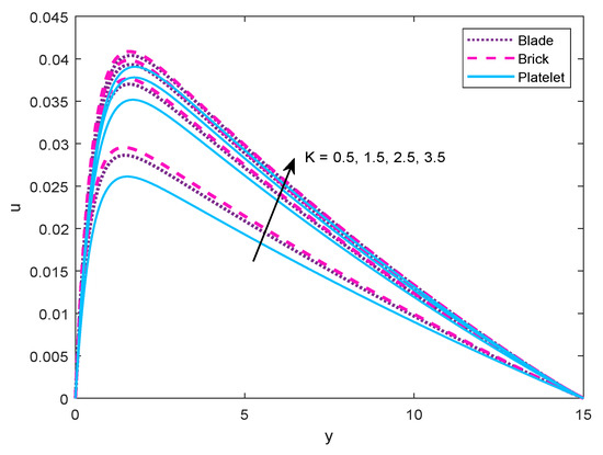 K on temperature distribution and velocity profile, respectively. It is noticed that temperature distribution and velocity field decreases and increases respectively with an increase in porosity parameter. The brick-shaped particles possess lowest temperature and highest velocity rates followed by blade-shaped and platelet-shaped particles.