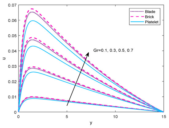 , a significant increase is observed in fluid flow. It is reasonable in the sense that maximum Grashof number is a source to upgrade the buoyancy force which buoyed up the nanofluid flow rates as a result the velocity field increases.