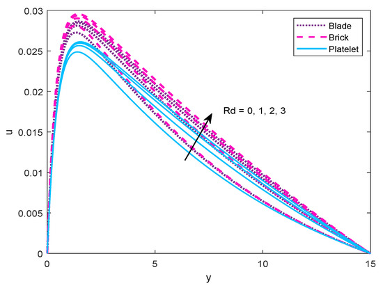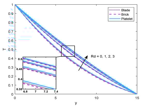 Rd = 0, 1, 2, 3) on the temperature and velocity profiles are plotted graphically. Additionally, the influence of regulating parameters on physical quantities