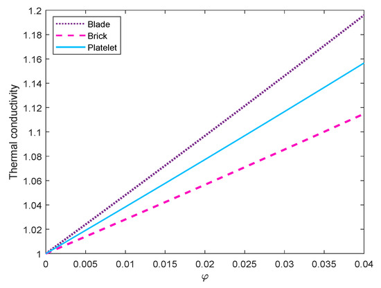 particle volume fraction. It is evident from the plot that the thermal conductivity for blade-shaped particle increases maximum with respect to volume fraction than other particles. The result is sensible in a way that the blade type particle has the highest sphericity compared with platelet and brick particles. On the other hand, the values of shape constant