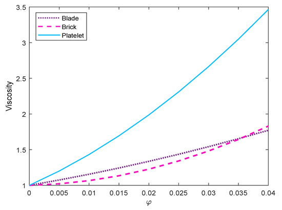 nanofluid is obtained by platelet-shaped nanoparticles. In addition, the viscosity of blade-shaped particle is greater than that of brick-shaped particles for (