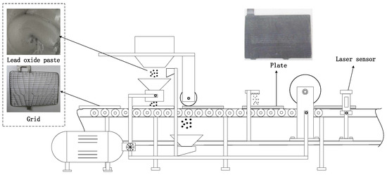 A lead-acid battery consists of basic cell blocks, and each cell block contains several plates. Plates are the basic components of lead-acid batteries, and unqualified plates will directly affect the initial capacity and cycle life of batteries. In general, plate production includes five processes: ball-milling, paste mixing, grid casting, pasting, and plate curing. Pasting is a critical process in plate production [18,19], and most components of poor quality batteries can be traced back to this process. The identification of abnormal pasting process is the key to ensure the quality of batteries. In the pasting process, the lead oxide pastes are squeezed into the gap between two sides of the grid, and then it is turned into a plate. The mechanism of the whole pasting process is shown in Figure 1. The uniformity of the lead oxide paste in the plate surface is a critical quality characteristic, which can be measured by plate thickness. Therefore, the change of uniformity will directly reflect the abnormal state of the pasting process.