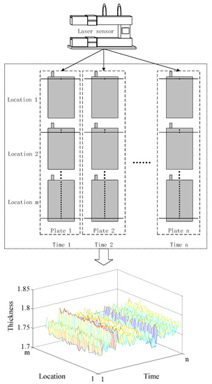 To obtain plate thickness data, a laser sensor is installed at the end of pasting equipment to collect the observations of the uniformity as shown in Figure 1. When a plate moves in the pasting process, the laser sensor records its thickness values at different locations over time as shown in Figure 2. In the pasting example, there are m locations to measure the uniformity of the plate. When a plate moves through the sensor, the data observed over m locations can be collected at one time. In other words, the uniformity of the plate can be described by the observations measured in the m locations, and the uniformity of different plates can be observed over time to indicate the condition of the current process. Actually, the observation of uniformity is represented as a vector, which can be collected at time t. The vector will become a matrix over time, which can indicate the stability of the pasting process. The matrix collected from the pasting process is bi-dimensional, including space and time dimension. The matrix visualized by a surface is shown in Figure 2.