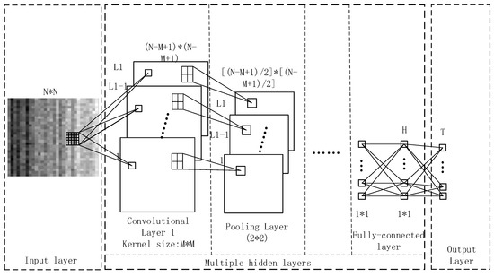 where and represent the updated weights and biases after the tth iteration. is the learning rate, and is a common selection [26]. The CNN architecture parameters consist of the numbers of convolution layers and convolution kernels, the size of convolution kernels per layer, the selection of pooling function, and the number of output nodes in the FC layer. These parameters are required to be stepwise determined, which will be discussed in the next section.