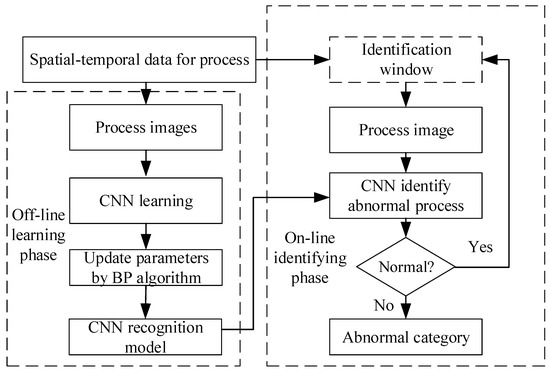 A CNN framework for the identifying abnormal process with spatial-temporal data is presented in this paper. This framework can be divided into two phases: offline learning and online identifying. The offline learning phase aims to train a CNN model from offline collected process images and establish an appropriate CNN recognition model. In the online identifying phase, this CNN model trained in the offline phase can be applied to identify the abnormal process with real-time spatial-temporal data. The CNN identification framework is shown in Figure 6, and the details are introduced in the following.