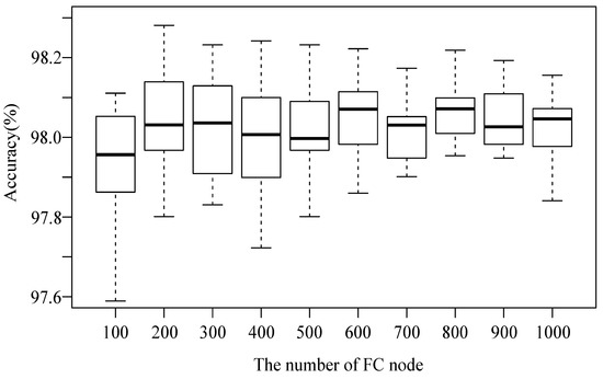 Under the 65-70-80 structure of the convolutional layer, the number of nodes in the FC layer needs to be determined. Ten scenarios for the numbers of FC nodes from 100 to 1000 are shown in Figure 7. By comparing the average recognition accuracy and standard deviation in different scenarios, we find that the accuracy increases to 98.08% at 800 nodes, and, after that, the accuracy does not exceed 98.08% by adding more nodes. Additionally, we observe that the variation of recognition accuracy becomes lower as the number of nodes in FC layer increases. From Figure 7, it is noted that the difference of recognition accuracy using various FC node numbers is not obvious enough, especially using 600 and 800. In this research, the node number corresponding to higher recognition accuracy and lower variation is preferred. Because the recognition accuracy using 800 nodes is slightly better than using 600, and the optimal number of FC nodes is set to 800. For the above discussion, the optimal architecture of CNN model is denoted as 65–70–80–800.