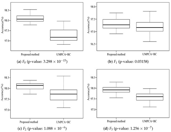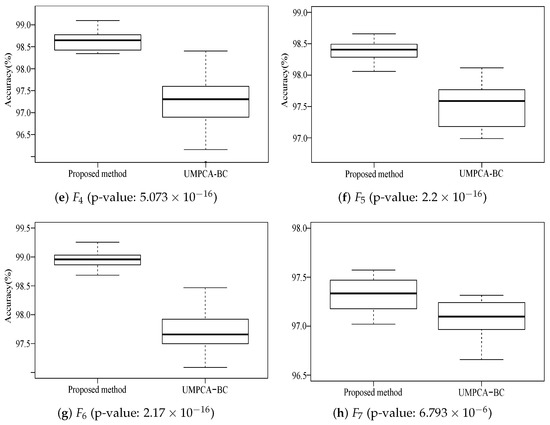 From Figure 9, in all process patterns, the proposed method is better than UMPCA-BC, though only slightly better at . To further test whether the proposed method outperforms the alternative method significantly in all process patterns, Mann–Whitney U tests are conducted, and their p-values are also presented in Figure 9. If the 1% level of significance is taken, the superiority of the proposed model is significant except . There are two reasons for this situation. Firstly, the rounding operation of the grayscale image makes the process lose detail information, which further makes our model not sensitive to a small shift in abnormal process pattern . Secondly, in practical production, the failure of the acid spouting system does have a great impact on the thickness uniformity of plates in a short time. In other words, the variation of thickness uniformity in is usually small in a limited size of identification window, which increases the similarity between normal pattern and pattern. As a result, the performance of the proposed method has a limited improvement at . However, in general, the CNN method proposed in this paper can identify the abnormal process with spatial-temporal data more accurately than the UMPCA-BC method.