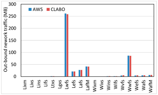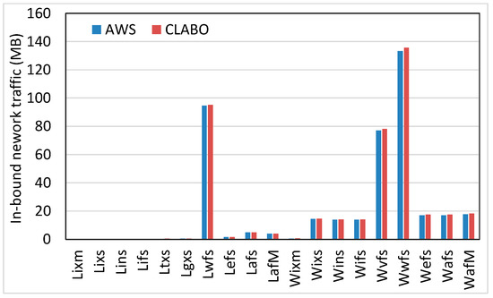 Let us now see the network resource usage. Figure 3 and Figure 4, respectively, show the in-bound and out-bound network traffic for each scenario. As shown in the figures, the difference between the network traffic monitored by CLABO and that of the AWS’s report is very small. In the case of the in-bound network traffic, the monitoring result of CLABO exhibits a little more than the AWS reports. Lwfs and Wwfs incur a large network traffic of 100 MB or more but the difference is still small enough.