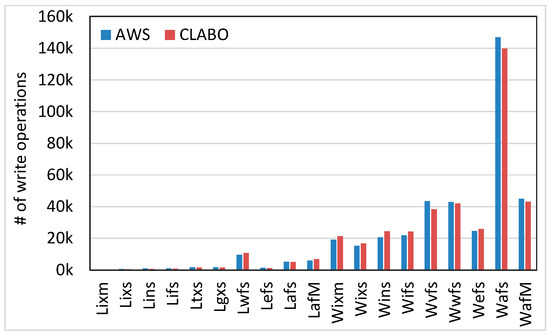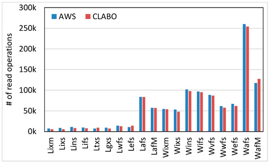 Figure 5 and Figure 6 show the number of storage I/Os in terms of the read and write operations, respectively. Unlike other resource cases, storage usage monitored by CLABO and that reported by AWS have a certain amount of gap. This is because most CSPs use an I/O count as the cost metric of storage activity, but it is difficult to count the exact number of I/O operations at an instance level. In particular, recognizing the initial I/O activities is difficult in CLABO as its monitoring routine starts after the initial I/O activities. Moreover, I/O requests issued by an instance are usually merged by the storage-layer policies.