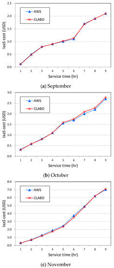 Figure 8 compares the total instance cost estimated by CLABO and the costs charged by AWS as time progresses. As the AWS usage report provides the billing information by the precision level of 1 h unit, we also compare the billing information provided by AWS and the estimated cost for each hour. As shown in the figure, the IaaS cost estimated by our model and the real cost charged are very similar. The error rate of the estimation is less than 1% for all cases although our estimation was performed instantly, and the accuracy is 99.3% on average compared to the actual charge of AWS.
