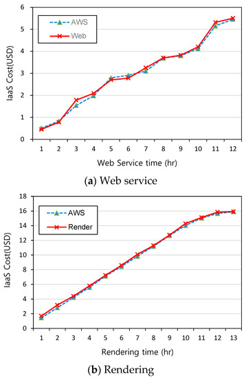 We conduct some additional experiments to validate the proposed model. In particular, we execute two types of workloads, rendering and web service, and compare the estimated cost of our model with the real AWS charge. Note that rendering is a computing-intensive workload, whereas web service is an I/O-intensive workload, which are the two representative types of workload that can be executed on cloud. Figure 9a depicts the accumulated hourly costs of our model and AWS charge when web requests were generated by the Apache benchmark. As AWS adopts the auto-scaling functionality, the number of web servers increases or decreases according to the evolution of workloads. However, as shown in the figure, the errors of estimated costs by our model (denoted as Web) are less than 1% for all cases. Figure 9b shows the results for the rendering workload. This experiment was conducted by using eight rendering servers, which are set to terminate automatically when each assigned job is finished. Rendering is a computing-intensive workload and the cost is mainly dependent on the instance running time, and thus the cost graph is almost linear as time progresses before the completion of the rendering job. As shown in the figure, we can again see that our model estimates the real AWS charge precisely and the error rate is below 0.9% for all cases.