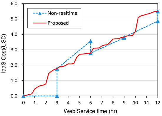 We perform another experiment to compare our model with the existing model that estimates the cost of a certain period in the future based on the resource usage of the previous history. As existing cost models predict future resource usage by adopting complicated modeling, it is difficult to be implemented as an instant monitoring module, so prediction should be performed periodically. Figure 10 compares the estimated cost of the proposed model in comparison with the existing model that estimates the cost every 3 h. In this experiment, eight web servers were serviced during 12 h. As shown in the figure, our estimation model performs better than the existing model as our model estimates the resource cost instantly, but the existing model overestimates or underestimates the IaaS cost depending on the previous usage of the resources even though it can be adjusted by periodic usage report. Note that this experiment does not imply the superiority of our model as it monitors the resource usage instantly, but the existing model predicts future resource usage beforehand, and thus the goals of the models are different.