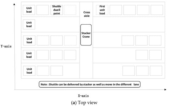 As shown in Figure 1, this new application inherits the merits of the AS/RS, and improves space utilization and storage capacity, as well as flexibility. AS/SC warehousing systems represent an improvement of AS/RS in terms of batch production and order processing, whereby shuttles can move between lanes via the stacker crane [8,9]. AS/SC warehousing systems have a stacker crane in each aisle and several shuttles. Motion in the y-axis and z-axis is enabled by the stacker crane. The shuttles move back and forth along the x-axis and deliver unit loads to the first storage cell of each lane. The unit loads are stored along the lane according to a last-in-first-out (LIFO) policy. The shuttle stops in the default dwell unit of the last previously inserted palletized lane, and performs the next retrieving or stocking action applied to that batch SKU. If a shuttle is required to switch to another lane, it must first move to the first storage unit of the current lane. Although each shuttle can execute all storage and retrieval tasks, the inbound shuttle and outbound shuttle will be located in different aisles if the storage and retrieval tasks are executed at the same time. In general, the number of shuttles in each aisle is determined by the number of different SKUs for simultaneous storage or retrieval tasks. For example, if there are two production lines that produce different SKUs, or there are two outbound loading stations, at least two shuttles would usually be required, one for each SKU. However, in some scenarios, there may be too few shuttles to cope with variations in demand. Moreover, the size of the warehouse can significantly affect the system efficiency. Determining the required number of shuttles based on scheduling of tasks in order to minimize the total operating time is not straightforward, but is a problem that should be resolved as part of the design of an AS/SC system.