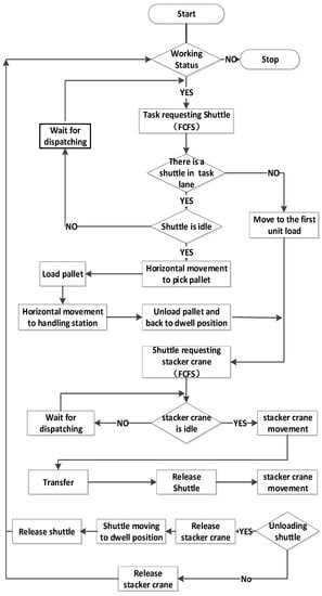 Retrieval tasks are critical to system performance, and here we consider retrieval tasks with the abovementioned assumptions. In addition to a few tasks whose starting position is the first unit storage location in the lane, the shuttles and stacker crane jointly complete most of the retrieval tasks, as shown in Figure 2. When the warehouse control system (WCS) assigns a retrieval task to the relevant lane and there is an available shuttle in that lane, if it is idle, the shuttle approaches the retrieval position of the task. The shuttle loads the pallet and carries it to the first storage cell of the lane where the shuttle can transfer the pallet to the stacker crane, and then returns to the default dwell point to await handover. If there are no shuttles in the retrieval task lane, the WCS sends the nearest idle shuttle to the first storage cell. As soon as the shuttle responsible for carrying the pallet moves to the dwell point or arrives at the first storage cell for preparation to move to the next task lane, it sends a stacker crane delivery request (SCDR) to the monitoring system. All SCDR tasks are executed based on the FCFS principle. Once the stacker crane arrives at the dwell point in the corresponding lane, the pallet or shuttle is transferred to the stacker crane. If the stacker crane is carrying a pallet, the WCS releases the shuttle for the subsequent retrieval task in the corresponding lane. The stacker crane continues to the destination position, carrying the pallet or shuttle. Finally, the stacker crane is released when the pallet or shuttle is unloaded at the destination position. When a shuttle carried by a stacker crane is unloaded, that shuttle should approach the dwell position for the new retrieval task.