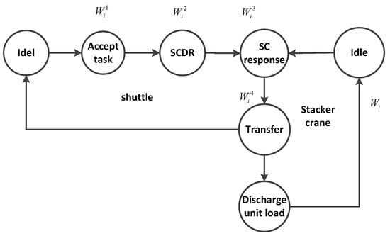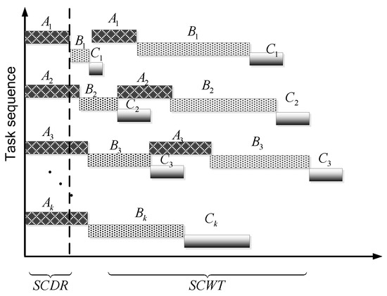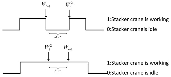 Several shuttles may execute tasks simultaneously; however, their finishing times may be different. According to the FCFS principle, there may be two types of stagnation period during the task execution period, as shown in Figure 4. These stagnation periods are critical for operational efficiency, as well as overall system performance. The first type of stagnation period is stacker crane idle time (SCIT), which is denoted , and occurs when an SCDR has not been made after the stacker crane finished the previous task. The second type of stagnation period is shuttle wasting time (SWT), and is induced when a shuttle sends an SCDR while the stacker crane is fulfilling a previous task, and is indicated by .