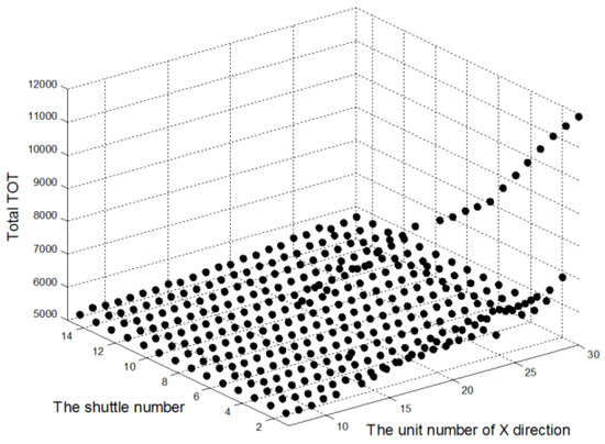 After some simulation experiments, we obtained a set of Pareto optimal solutions and found the optimal number of shuttles with various unit depths. We obtained TOT and SWT with varying numbers of shuttles and depths, as shown in Figure 6 and Figure 7.