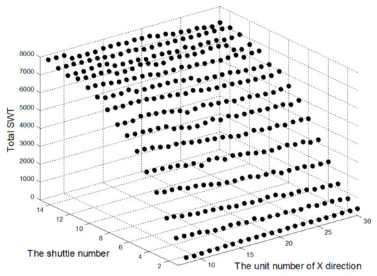 When there are three or four shuttles, TOT and SWT are optimized. If there is only a single shuttle, the change of depth k influenced TOT significantly; however, when there are three or four shuttles, k had little effect. When there are more than four shuttles, TOT is acceptable but SWT increased rapidly. This is because there are too many shuttles, but only one stacker crane. The stacker crane has limited capacity and can only release or load a limited number of shuttles or pallet per operating cycle. Therefore, in a certain period of time, multiple shuttle vehicles will be idle. When we used a general stacker crane with fewer than 30 storage cells in the x-axis, the optimal number of shuttles for the warehousing system is 4.