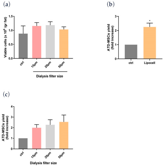 (a) The number of viable cells on the adipose tissue weight (samples, n = 9) was comparable among the different filters and control. (b) Adipose tissue-derived mesenchymal stem cell (ATD-MSC) percentage from Lipocell-processed adipose tissue (Lipocell, n = 27) increased compared to the relative untreated control from the same donor, * p < 0.01. (c) ATD-MSC yield of samples from different filter sizes (n = 9).