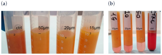 No differences in ATD-MSC yield were detected when testing pore size membranes (50 µm, 20 µm, or 15 µm). Oil and blood removal efficiency was tested. Lipocell products showed an excellent clearance from oil and blood in comparison with the control (Figure 2a). Spectrophotometric quantification of Hb showed a barely detectable Hb concentration in Lipocell-treated samples compared to untreated lipoaspirate (0.05 ± 0.01 g/dL versus 6.8 g/dL). When observing the floating oil, the 50 µm-sized membrane showed a better clearance from residual oil (Figure 2b).