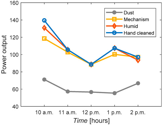 All four conditions were calculated at different times, and then plotted in Figure 3. The measurements for all the previous four experiments were conducted by having four different setups on 16 May 2019. The solar irradiation varied throughout the period of the measurements from 720–820 W/m2. Moreover, the dust accumulated was measured by using a dust measuring device PCE-RCM 05 (PCE Instruments, Jupiter, Palm Beach, FL, USA), which is an optimal test instrument to have a constant overview of the fine dust content. In general, as time passed by during the day, the power generated by the solar panel decreased. The cleaning mechanism showed an excellent result in improving the power, especially when it was partially covered with dust. The hand cleaning result was close to the mechanism output data. This confirms the success of the cleaning system, which is thus recommended for any future solar panel installation within the Kingdom.