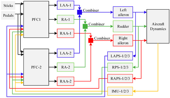 The lateral-directional flight control system is composed of a flight control computer subsystem, an actuation subsystem, a sensor subsystem and control surfaces. The flight control computer subsystem has a dual redundant architecture that is composed of two identical primary flight computers (PFCs). The actuation subsystem includes the left aileron actuation (LAA), the right aileron actuation (RAA) and the rudder actuation (RA). Each of them is composed of two redundant actuators that are connected with a combiner. The sensor subsystem includes the right aileron position sensors (RAPS), the left aileron position sensors (LAPS), the rudder position sensors (RPS) and the inertial measurement units (IMU). All of them have a triple modular redundant architecture. The control surfaces for lateral control include the left aileron, the right aileron and the rudder. Pilots’ commands from pedals and control sticks are converted to electronic signals transmitted by wires to the two PFCs, and control commands are calculated in terms of control laws in the PFCs to determine the movements of the actuators for all control surfaces. The architecture of the lateral-directional flight control system is shown in Figure 1.