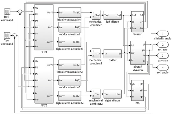 By combining the Simulink models of all components, we can build the Simulink model of the lateral-directional flight control system, which is shown in Figure 3. In both Figure 2 and Figure 3, the symbol “*” is used to note the output variables of the control laws.