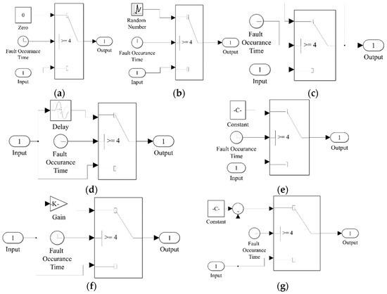Simulink models of the seven failure modes: (a) “omission”, (b) “random”, (c) “stuck”, (d) “delayed”, (e) “trailing”, (f) “gain change”, and (g) “biased”.