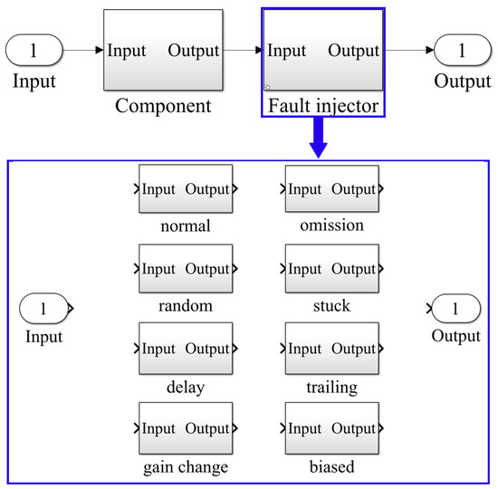 The fault injection is conducted by a “fault injector”, which is a “Variant Subsystem” block placed between each component block and its output. Figure 5 shows the fault injector and its inner structure. The fault injector includes the blocks of the seven failure modes given in Figure 4a–g as well as an additional “normal” block. The “normal” block denotes the failure-free configuration; its inner “Input” connects “Output” directly.