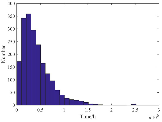 By conducting the Monte Carlo simulation procedure given in Section 4, we obtain nearly 2000 samples of time to unsafe conditions, whose histogram is shown in Figure 8. According to the shape of the histogram, it can be estimated that these samples may follow Weibull distribution or Lognormal distribution. For the kth sample , the estimate of the related cumulative distribution function (CDF) can be expressed as