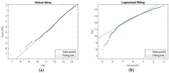 (a) The plotting of Weibull fitting; (b) The plotting of lognormal fitting.